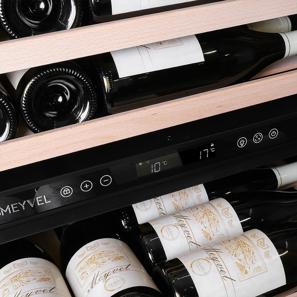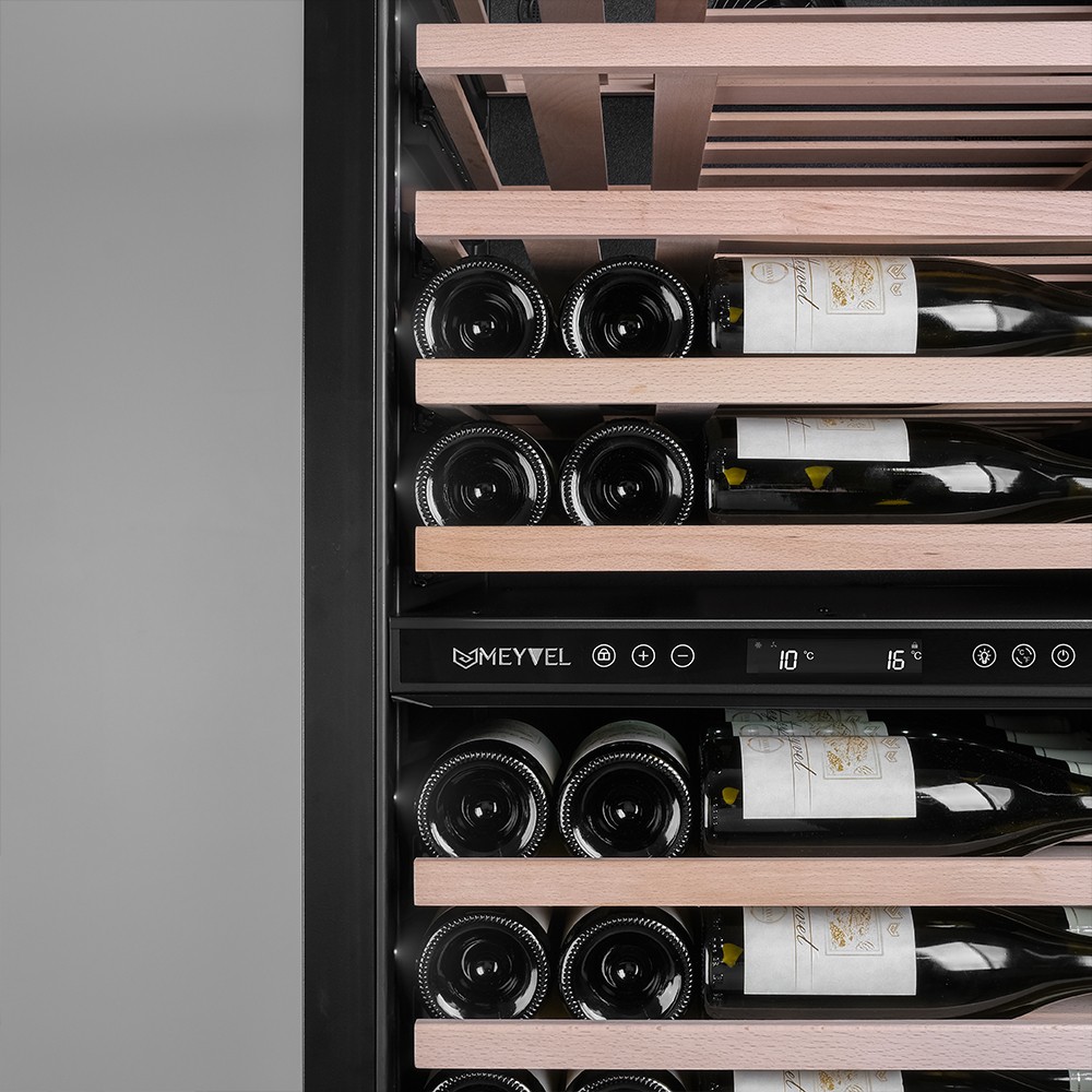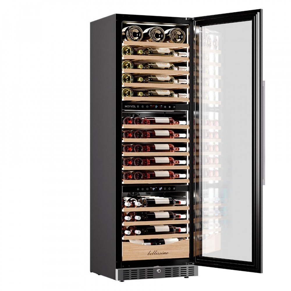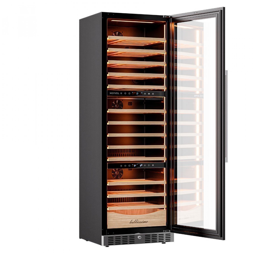 Винный шкаф Meyvel | Мэйвел MV98-KST3 (Slim)— идеальное место хранения и демонстрации коллекции вин в ресторанах, барах или винных комнатах. Он вмещает внушительную винотеку до 98 бутылок типа «Бордо», а если размер бутылки нестандартный, то съемные полки решат эту проблему. Три независимые температурные зоны для разных сортов напитков: верхняя поддерживает температуру от +5 до +20°C, средняя — от +5 до +12°C, нижняя — от +12 до +20°C. Подсветка белого, синего или янтарного цвета создает правильную атмосферу для эффектной демонстрации содержимого. Модель MV98-KST3 (Slim) может быть как отдельностоящей, так и встроенной в нишу, а перенавешиваемая дверь предоставляет возможность разместить ее в любом удобном месте. Стоит отметить низкий уровень шума — всего 41 дБ, поэтому холодильник для вина не потревожит владельца неприятными громкими звуками. Для вашего спокойствия Meyvel MV98-KST3 (Slim) оснащен системой сигнализации, которая оповестит об отклонениях температуры, функцией блокировки панели управления, предотвращающей случайные изменения настроек. Угольный фильтр очищает воздух внутри шкафа от посторонних запахов. Надежный, функциональный и стильный винный шкаф Meyvel MV98-KST3 (Slim) станет достойным украшением ресторана, бара, гостиницы или кухни опытного коллекционера.