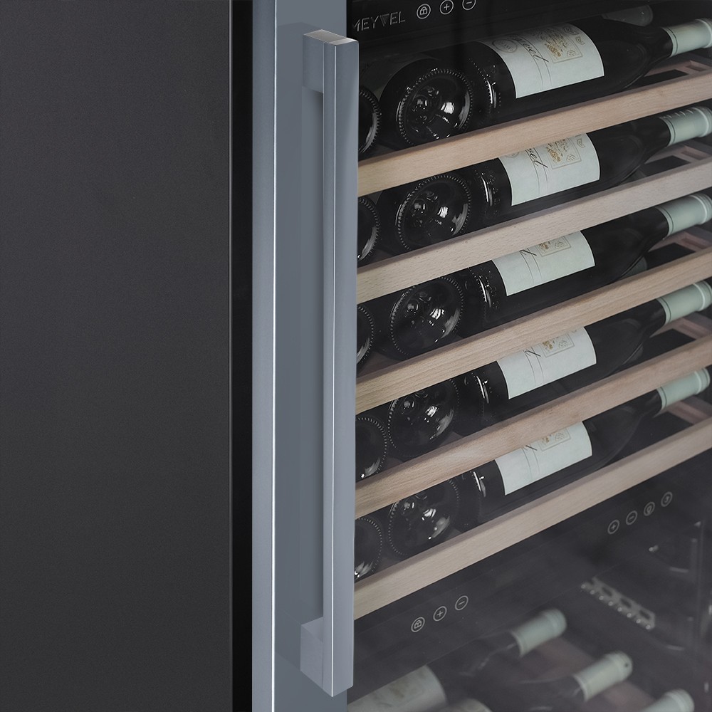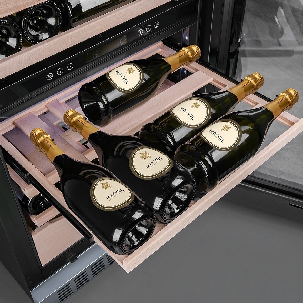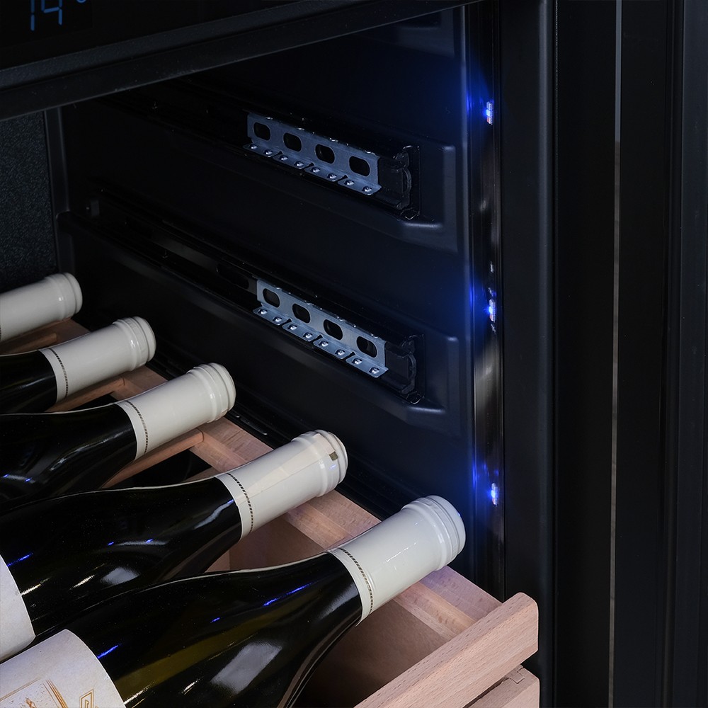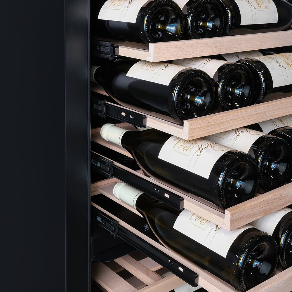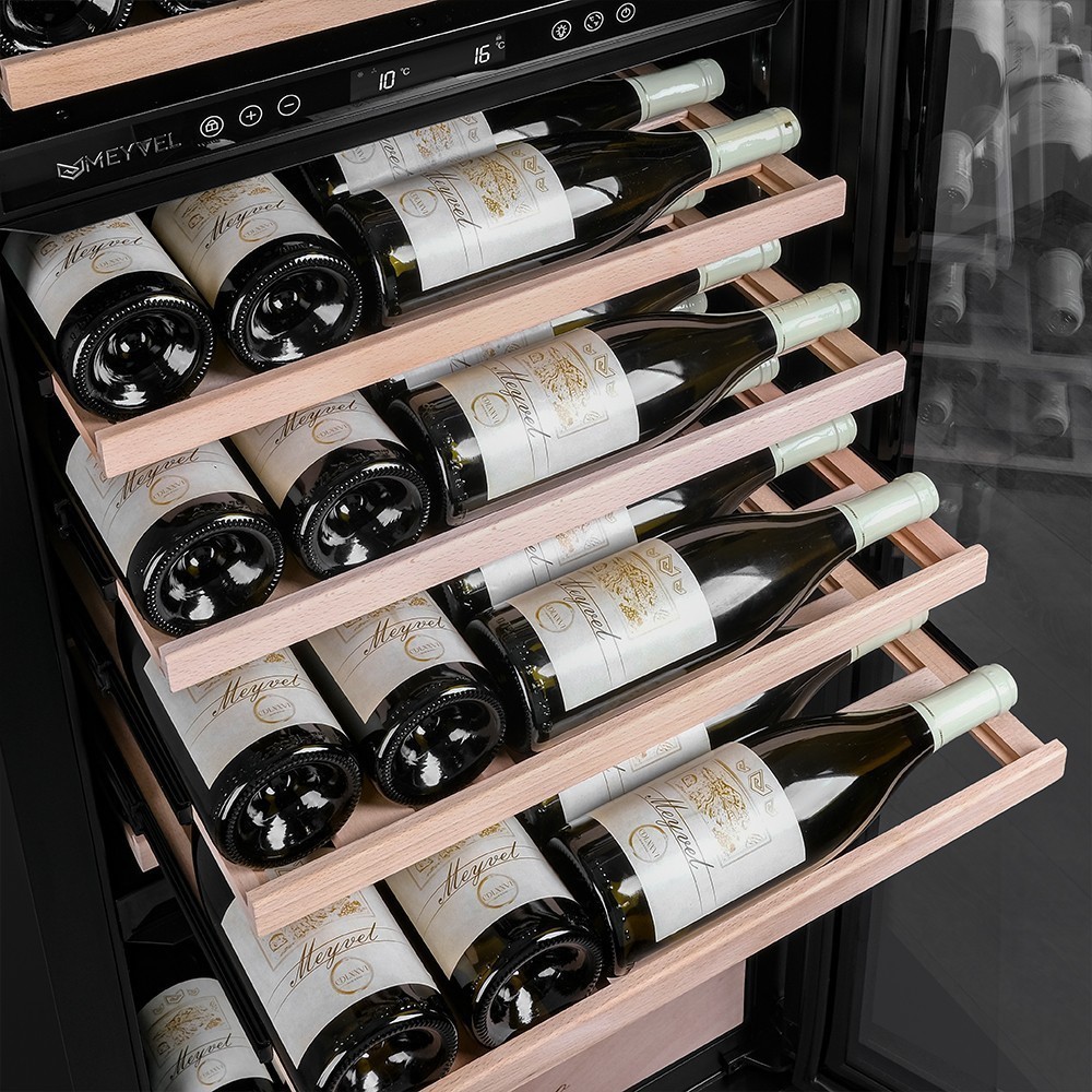 Винный шкаф Meyvel | Мэйвел MV98-KST3 (Slim)— идеальное место хранения и демонстрации коллекции вин в ресторанах, барах или винных комнатах. Он вмещает внушительную винотеку до 98 бутылок типа «Бордо», а если размер бутылки нестандартный, то съемные полки решат эту проблему. Три независимые температурные зоны для разных сортов напитков: верхняя поддерживает температуру от +5 до +20°C, средняя — от +5 до +12°C, нижняя — от +12 до +20°C. Подсветка белого, синего или янтарного цвета создает правильную атмосферу для эффектной демонстрации содержимого. Модель MV98-KST3 (Slim) может быть как отдельностоящей, так и встроенной в нишу, а перенавешиваемая дверь предоставляет возможность разместить ее в любом удобном месте. Стоит отметить низкий уровень шума — всего 41 дБ, поэтому холодильник для вина не потревожит владельца неприятными громкими звуками. Для вашего спокойствия Meyvel MV98-KST3 (Slim) оснащен системой сигнализации, которая оповестит об отклонениях температуры, функцией блокировки панели управления, предотвращающей случайные изменения настроек. Угольный фильтр очищает воздух внутри шкафа от посторонних запахов. Надежный, функциональный и стильный винный шкаф Meyvel MV98-KST3 (Slim) станет достойным украшением ресторана, бара, гостиницы или кухни опытного коллекционера.