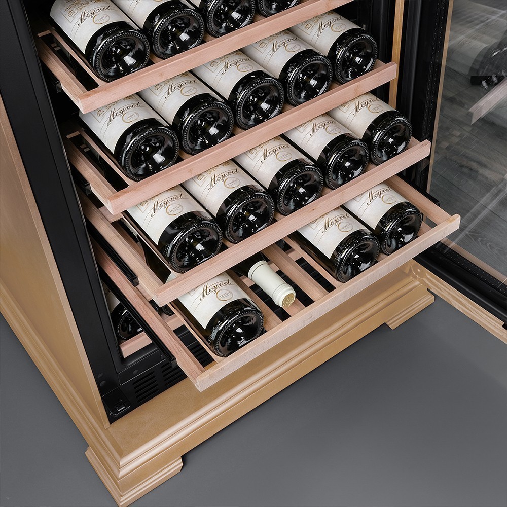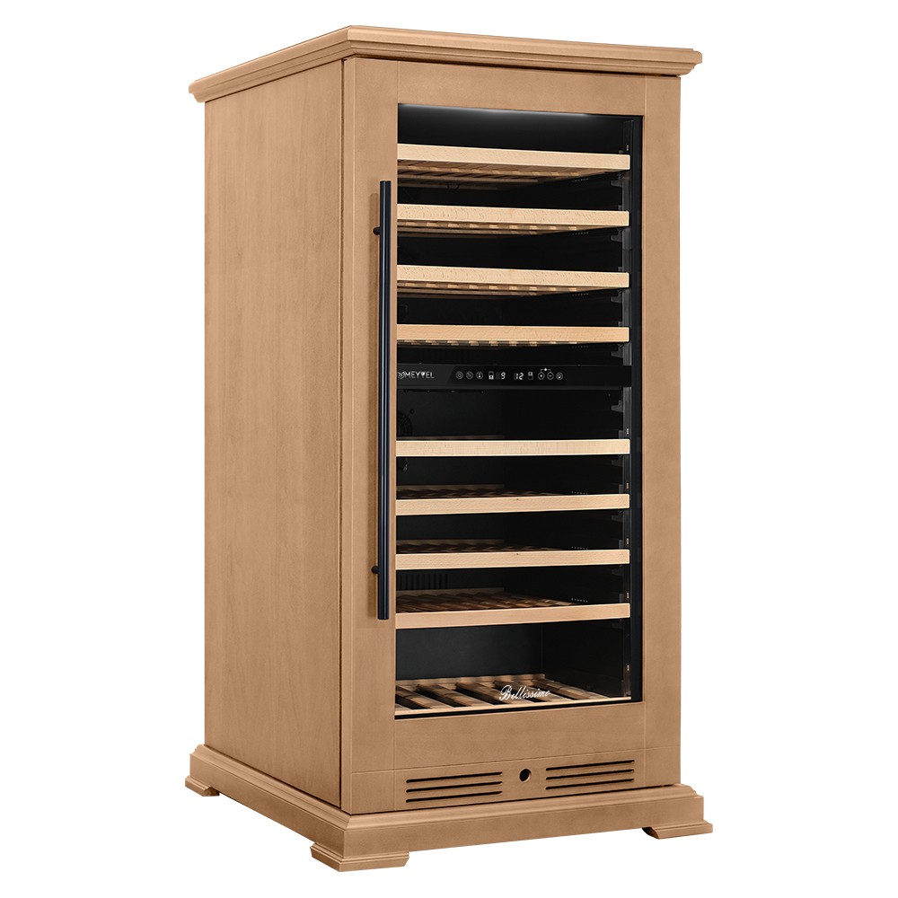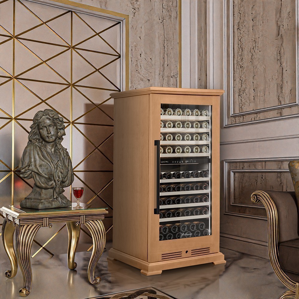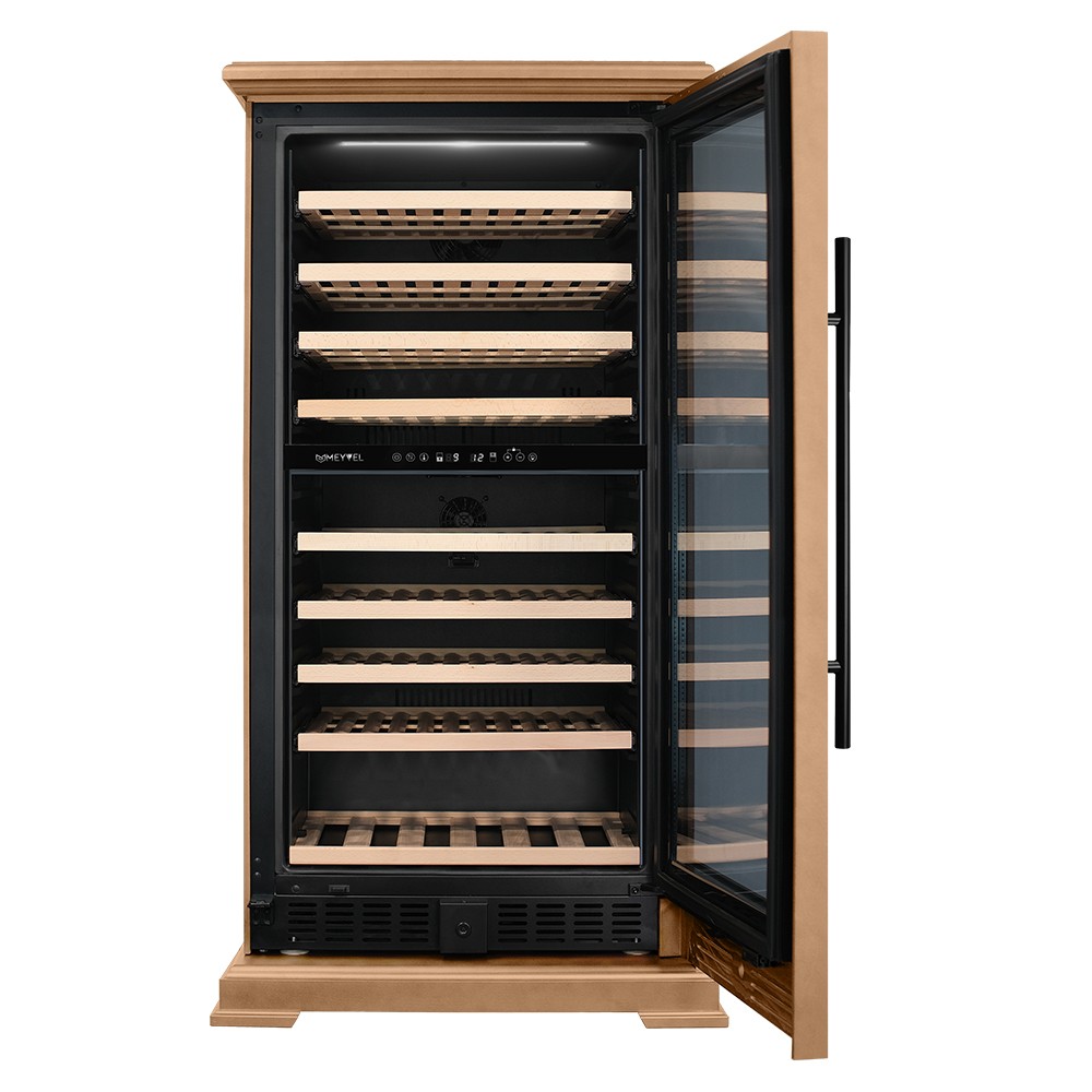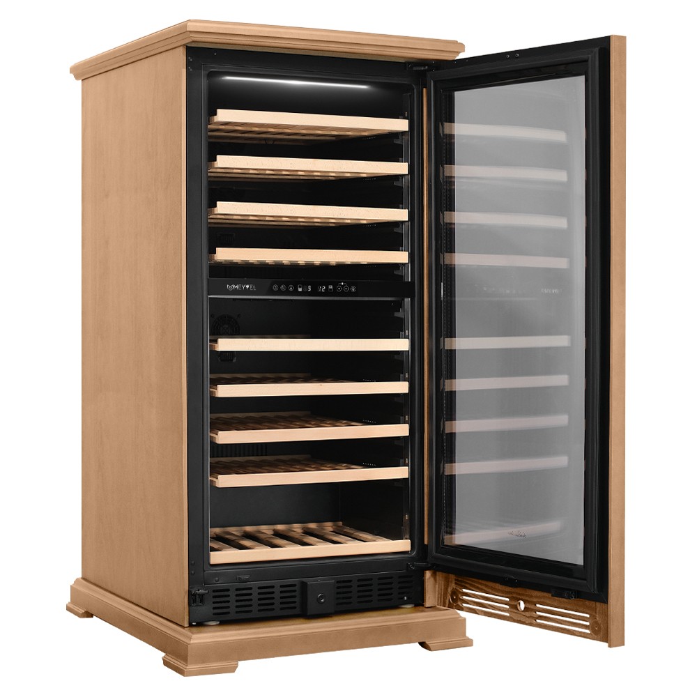 Винный шкаф Meyvel | Мэйвел MV99PRO-KBT2 — имеет привлекательный внешний вид, сочетающий в себе неподвластное времени очарование натуральных материалов с высокотехнологичными системами сохранения продуктов. Винный холодильник Meyvel MV99PRO-KBT2 оснащен дверью с защитой от ультрафиолетовых лучей и отлично подойдет для хранения и созревания различных сортов вин. Динамическая система охлаждения обеспечивает оптимальную температуру для вина и сохраняет необходимую влажность внутри камеры. Стальной корпус обшит натуральным деревом, который выдерживает большие нагрузки и обладает красивой текстурой. Компрессорный винный шкаф Meyvel MV99PRO-KBT2 обладает большой вместимостью и способен разместить до 99 бутылок. Располагаются они на полках из массива бука. Внутреннее пространство шкафа разделено на 2 температурные зоны с возможностью настройки в диапазоне от + 5°C до +20°C. Холодильник поддерживает влажность в диапазоне 60-80%, как в настоящем винном погребе.
