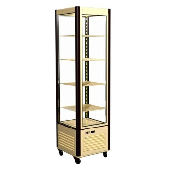 Витрина кондитерская Полюс D4 VM 400-1 (R400C Сarboma Люкс) (0109-0102 (коричнево-золотой)) - это выгодная презентация кондитерских изделий в кафе, барах, ресторанах. Изделие представляет собой эстетично оформленный холодильный шкаф с максимально возможной демонстрационной способностью. Все четыре стенки шкафа прозрачные, выполненные из энергосберегающих стеклопакетов. Цветовая схема Люкс: панель машинного отделения, верхняя панель, стойки под полки, поддон - сталь цвета «золото», рамка двери – профиль «золото», стойки – сталь коричневого цвета.