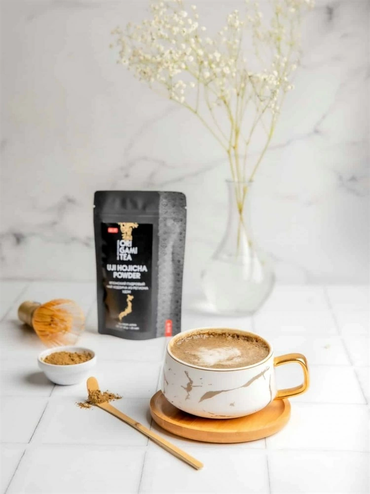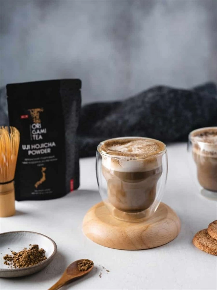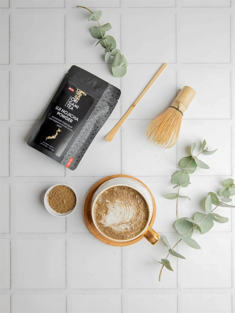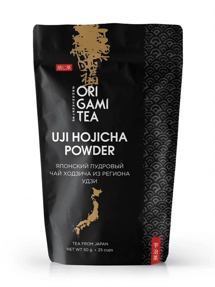 Японский чай Удзи xодзича пудровый Оригами 50 г. Для вкуснейшего ходзича латте, вечерний. Пудровый чай ходзича — обжаренный зелёный чай ходзича, перемолотый в пудру. Этот чай имеет особый орехово-карамельный вкус, а горячее молоко идеально проявляет уютный согревающий вкус этого чая. Его вкус очень схож со вкусом кофе латте, однако содержание кофеина в ходзича латте будет гораздо ниже, что позволяет употреблять этот вкуснейший напиток к любое время суток.